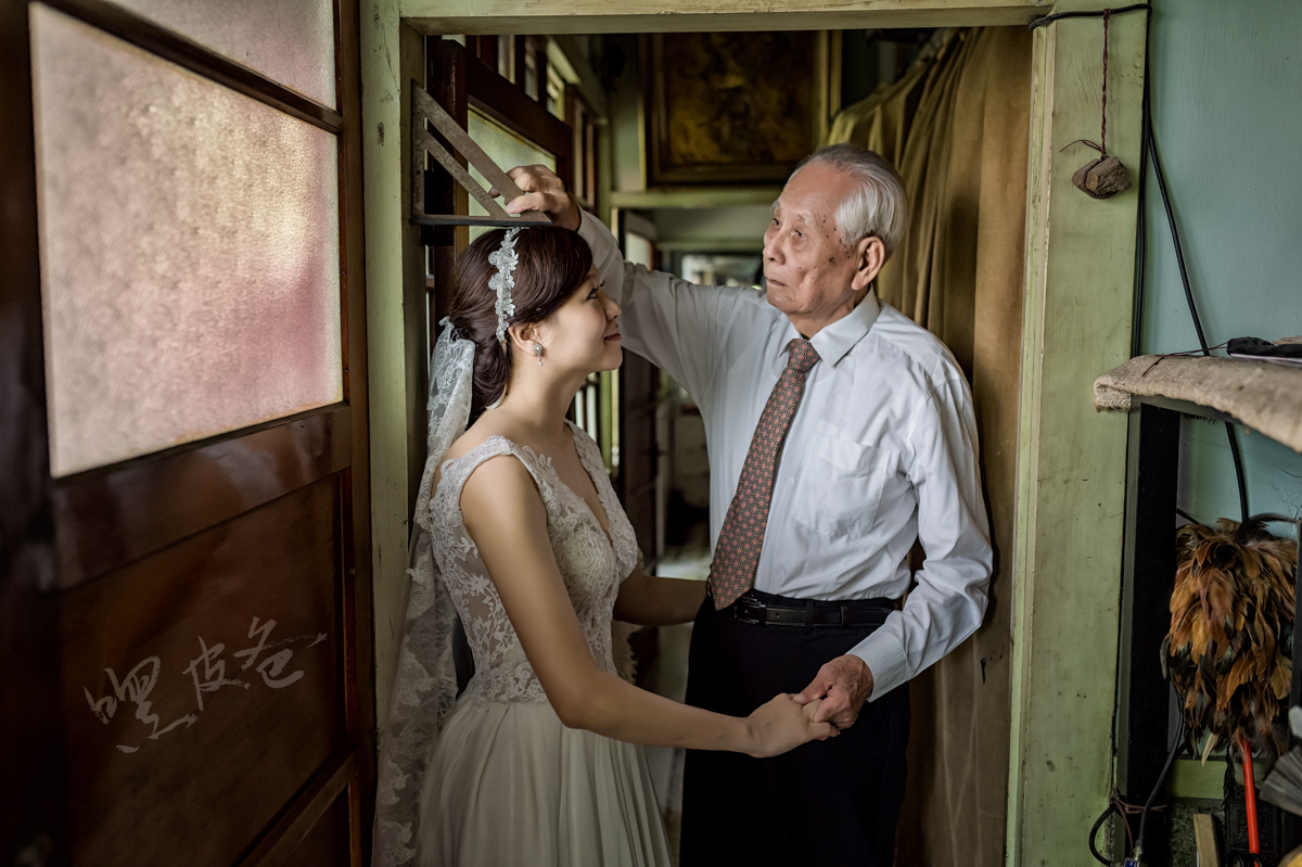 ,前些日子也為新人完成婚紗拍攝,當天上半天在阿公家拍攝有點像婚禮紀錄的形式,我也為新娘和家人拍攝了一些合照畫面,似乎是因為老建築的關係,每一個角落的味道似乎都充滿了濃濃的情感,而這張相片,就是新娘早已設定好要請90幾歲的阿公幫她量身高的畫面,拍著這張相片,我的心情也是悸動的,也讓我依稀記起小時候,我阿公和爸爸幫我量身高在牆壁上畫線的畫面,頓時之間,心裡也是有滿滿的感觸,自己手上的相機也是越握越緊,那怕這一刻沒拍好,新娘和家人之間的情感畫面,將因為我而失去,我想至少我們為許多人盡了些棉薄之力,藉由相片留下一些回憶,而這就是身為婚攝的驕傲。